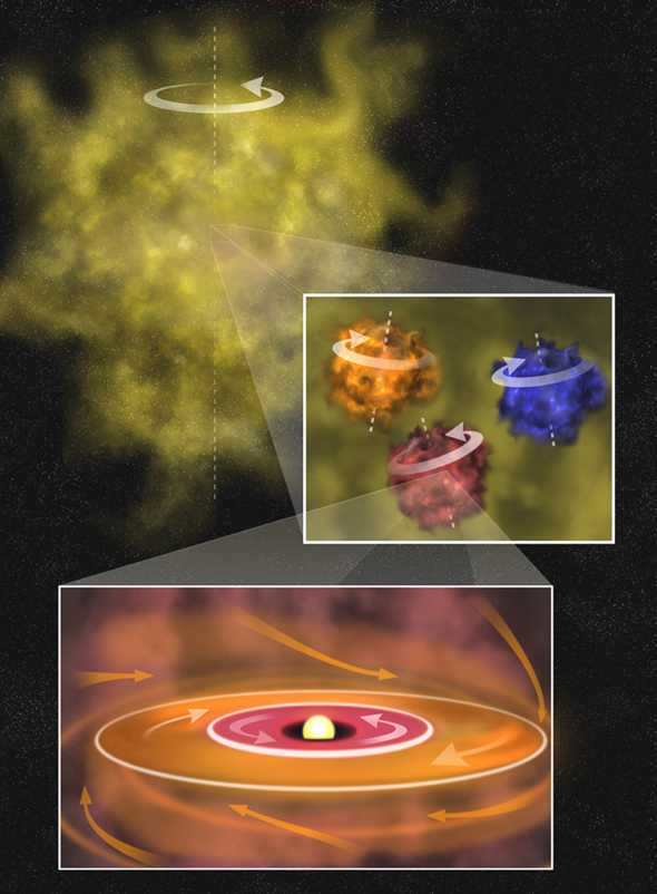 Astronomové, studující prachový disk kolem rodící se hvězdy uvnitř naší Galaxie, dospěli k překvapivému výsledku: vnitřní část disku rotuje kolem protohvězdy opačným směrem než jeho vnější oblasti. „Toto je první případ, kdy někdo pozoroval něco podobného. Je to důkaz, že procesy formování planet v takovýchto discích jsou mnohem komplikovanější, než jsme doposud předpokládali,“ říká Anthony Remijan (National Radio Astronomy Observatory, NRAO), který učinil tento objev na základě pozorování pomocí radioteleskopu. Planetární soustava, která se pravděpodobně zformuje kolem této hvězdy, bude obsahovat planety, obíhající dvěma různými směry, na rozdíl od našeho Slunce, kde všechny planety obíhají stejným směrem.